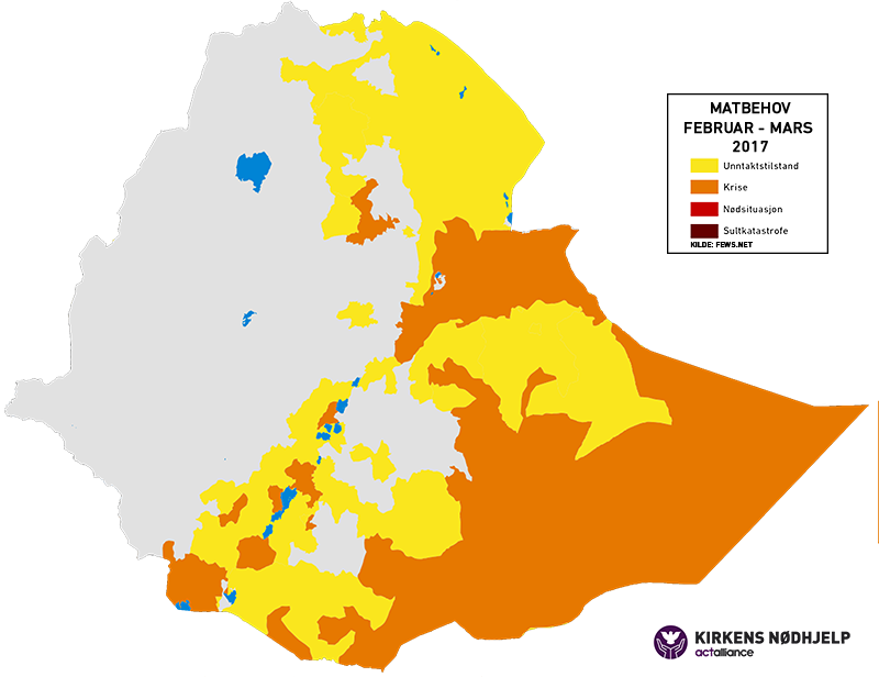 I 2016 ble Etiopia rammet av en tørke, som en følge av værfenomenet El-Niño. Samtidig som landet er i ferd med å bygge opp forholdene etter fjorårets tørke, står de nå foran en ny tørke fra blant annet værfenomenet som følger El-Niño; La-Niña. Årets tørke rammer store deler av Etiopia, hvor 5,6 millioner millioner har usikker tilgang på mat og 9,1 millioner mennesker trenger vann. Kirkens Nødhjelp har arbeidet med å forbedre vanntilgangen for mennesker i Etiopia i en årrekke, og dette arbeidet blir enda viktigere i en tørkesituasjon. Nå er de i ferd med å øke denne innsatsen, og ser i tillegg på muligheter for å bedre matvaresikkerheten på lengre sikt, blant annet ved å distribuere såkorn så folk kan sette nye avlinger etter tørken.
