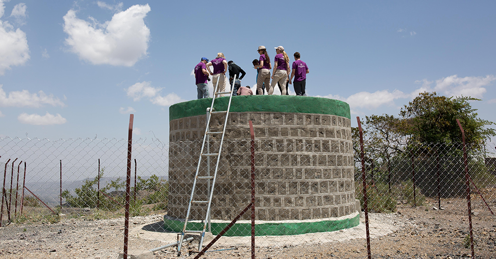Representanter fra Kirkens Nødhjelp står på toppen av vannreservoaret som lagrer vannet fra vannkilden i fjellet. Herfra fordeles vann nedover dalen via rør og flere tappestasjoner.