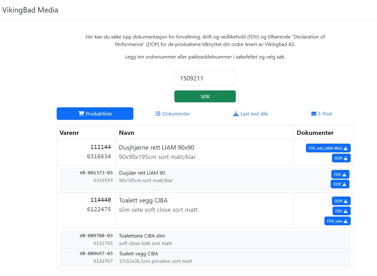 Det er store krav til dokumentasjon ved bygging av bad og vi har derfor utviklet en løsning der du enkelt kan laste ned all nødvendig dokumentasjon på et sted. Her kan du velge mellom å søke opp og laste ned all dokumentasjon knyttet til din ordre, eller søke etter dokumentasjon til enkelt produkter.